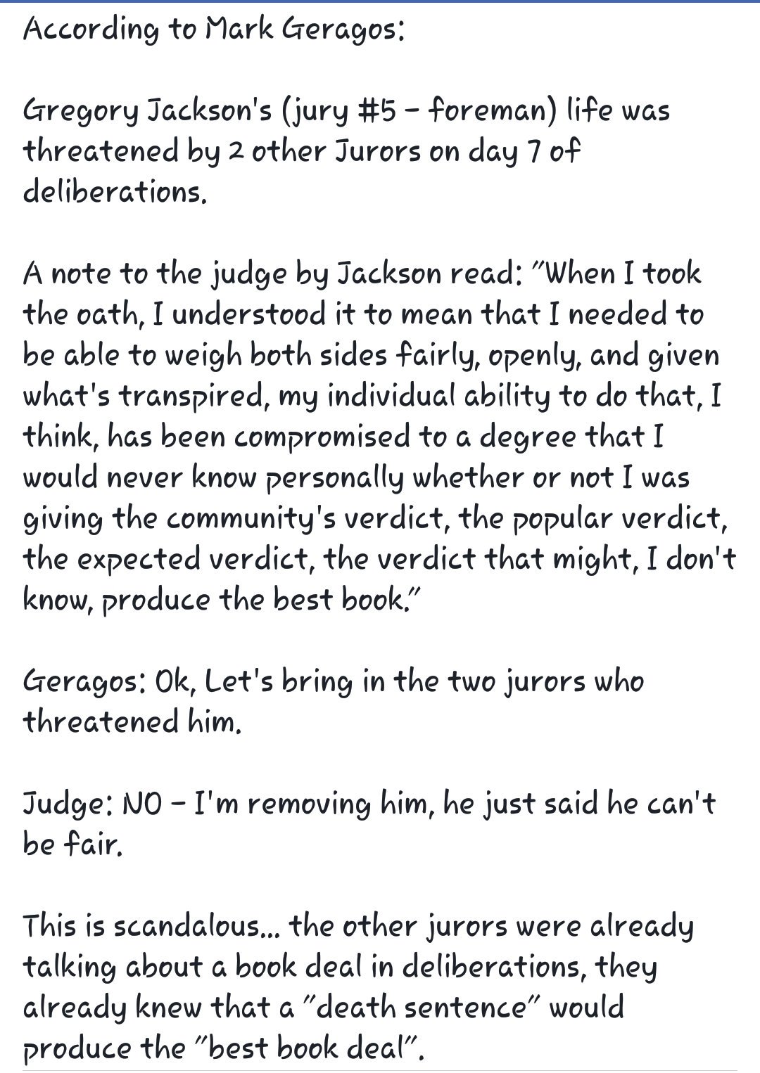This is what Gregory Jackson, the 1st foreperson, told the judge who dismissed him instead of the problematic jurors.